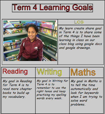 Room 5 have reset their learning goals for term 4. Some students have found they are working on similar goals others have changed their goals completely. Here is an example. For more information on what your child is working on at school there are learning goals on display in our class. An electronic version will be sent to your child's email which they can also share with you at home.